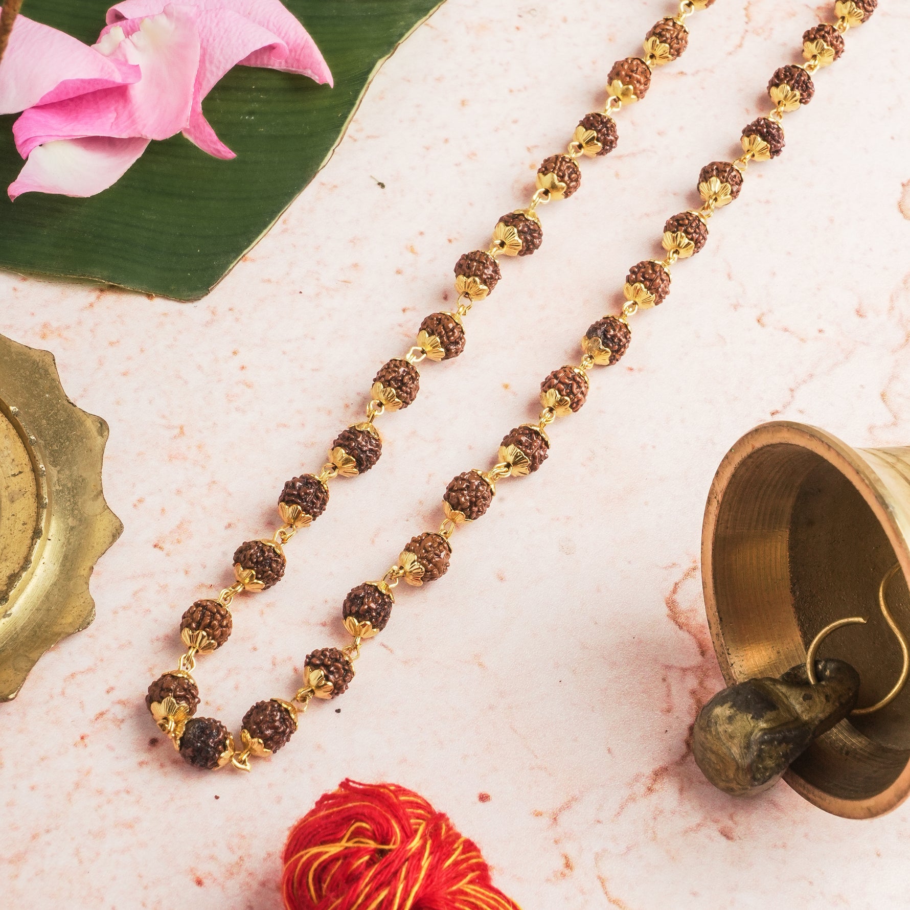 Handcrafted from genuine Rudraksha beads and beautifully enhanced with gold plating, this mala is known for its calming effects. Rudraksha is believed to deepen meditation, promote emotional balance, and attract positive energies.