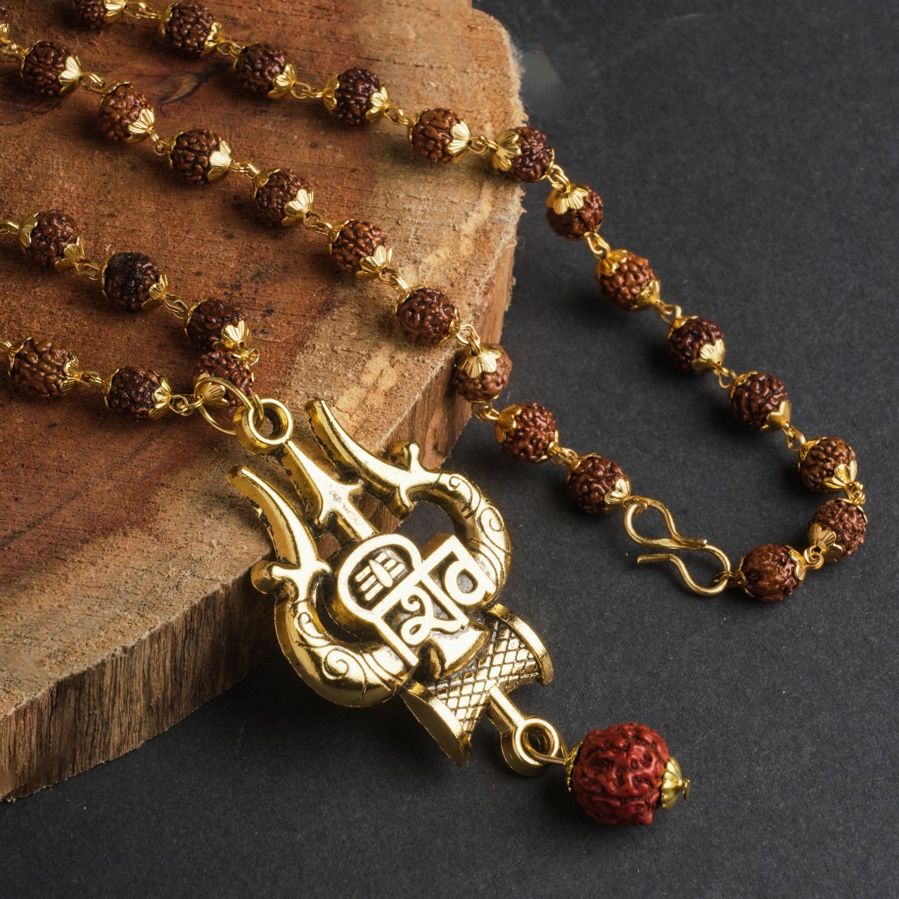 Crafted from genuine Rudraksha beads and beautifully complemented with gold plating, this piece is a symbol of spiritual elegance. Rudraksha is renowned for its soothing effects, believed to enhance meditation, promote emotional stability, and attract positive energies. The Shiva Trishool symbol adds an extra layer of spiritual connection, representing universal consciousness and harmony.