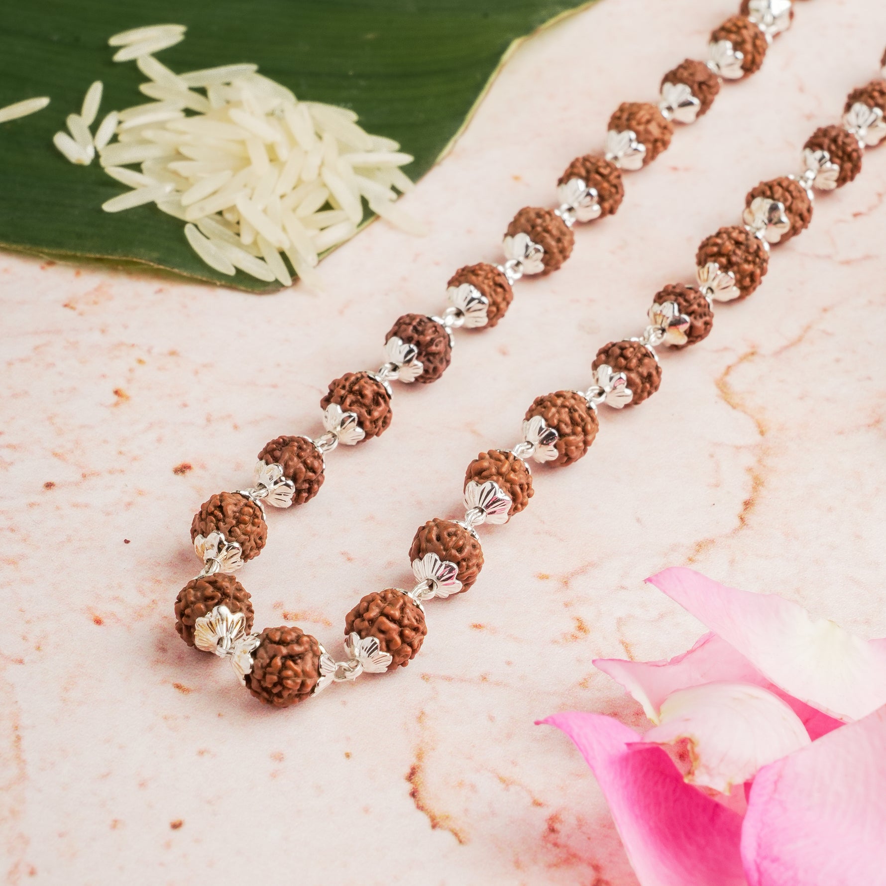 Handcrafted from genuine Rudraksha beads and beautifully enhanced with silver plating, this mala is known for its calming effects. Rudraksha is believed to deepen meditation, promote emotional balance, and attract positive energies.