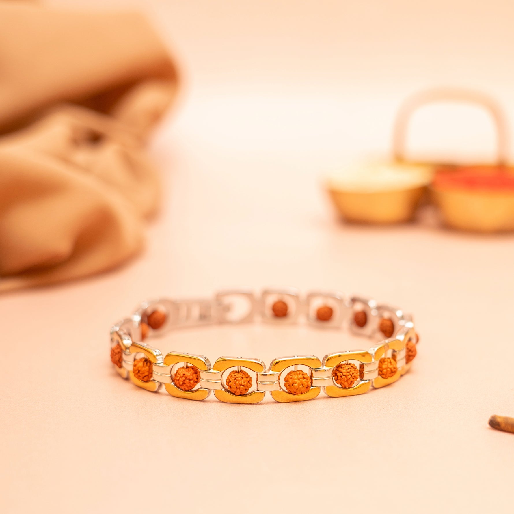 Featuring genuine Rudraksha beads, known for their spiritual and healing properties, and accented with luxurious gold plating, this bracelet is ideal for those who value both style and significance. It’s a perfect accessory to channel inner peace and positivity while adding a refined touch to any outfit.